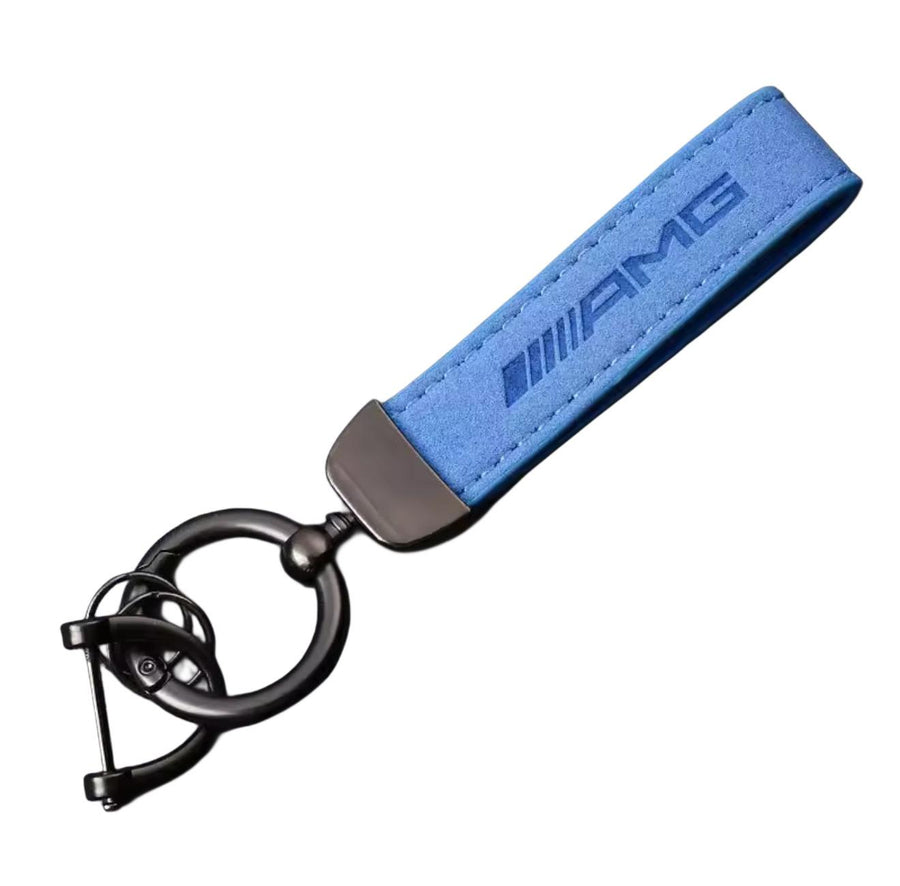 Performance zum Anfassen – der AMG Schlüsselanhänger aus blauem Wildleder ist ein stilvolles Statement für alle, die Dynamik und Design schätzen.