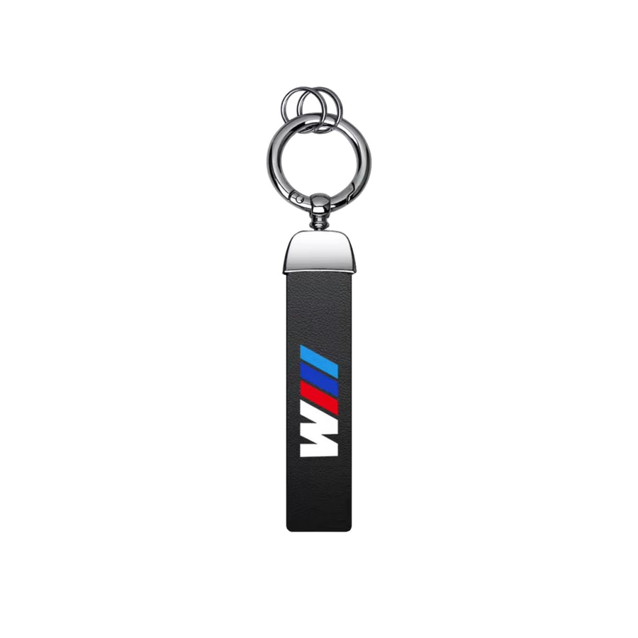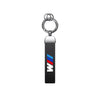 Kompakter Schlüsselanhänger mit der ikonischen ///M-Streifen-Grafik in Hellblau, Dunkelblau und Rot auf schwarzem Leder-Look. Der drehbare Metallring hält Autoschlüssel und Anhänger sicher zusammen, während das flache Band angenehm in der Hand liegt – perfektes Statement für alle Fans leistungsstarker BMW M-Modelle.