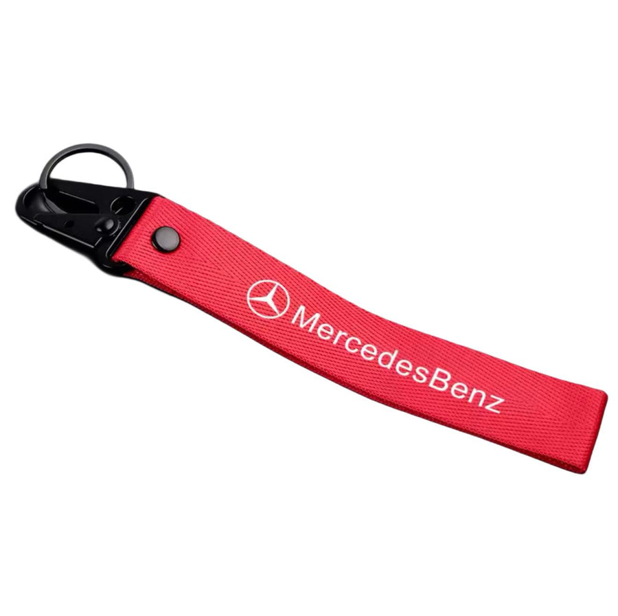 Exklusiver Schlüsselanhänger aus Textil für Mercedes-Benz in auffälligem Rot mit klassischem weißem Mercedes-Logo. Das robuste Gewebeband und der schwarze Metallclip machen ihn zu einem stilvollen und funktionalen Begleiter im Alltag.
