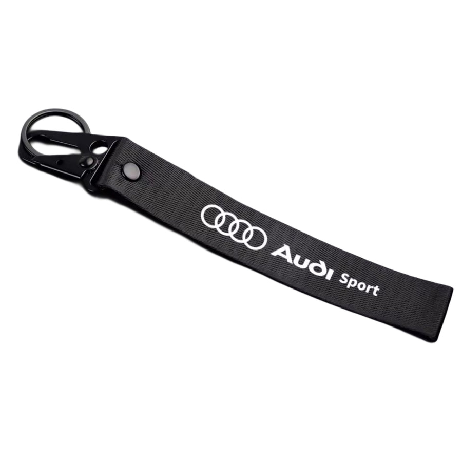 Hochwertiger Schlüsselanhänger im Audi Sport Design – perfekt für jeden Fan der Vier Ringe. Der schwarze Anhänger aus strapazierfähigem Nylon ist mit dem weißen Audi Sport Logo bedruckt und verfügt über einen robusten Karabinerhaken zur sicheren Befestigung. Ideal für Schlüssel, Taschen oder als stilvolles Accessoire für unterwegs.