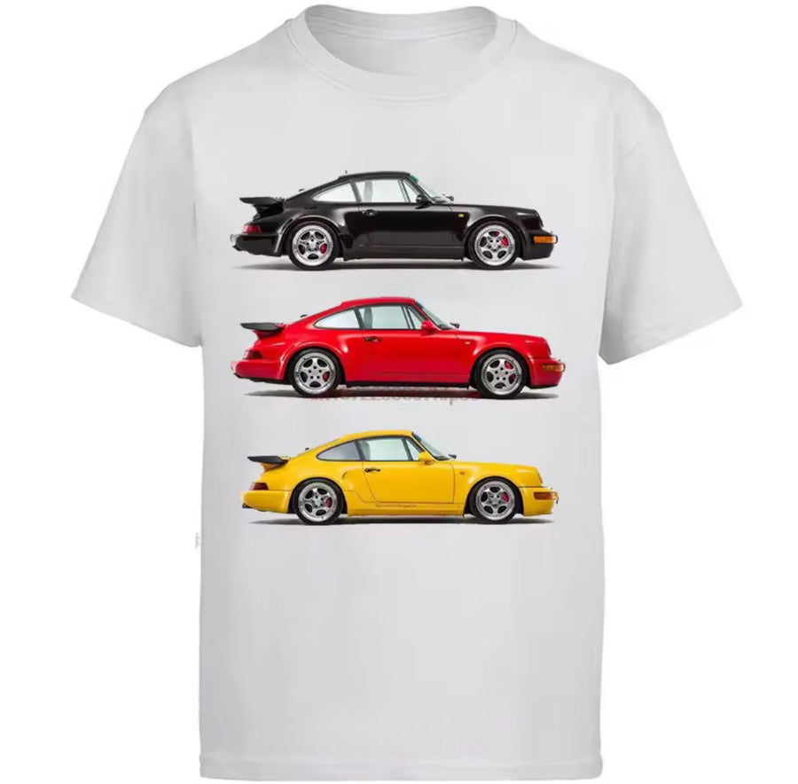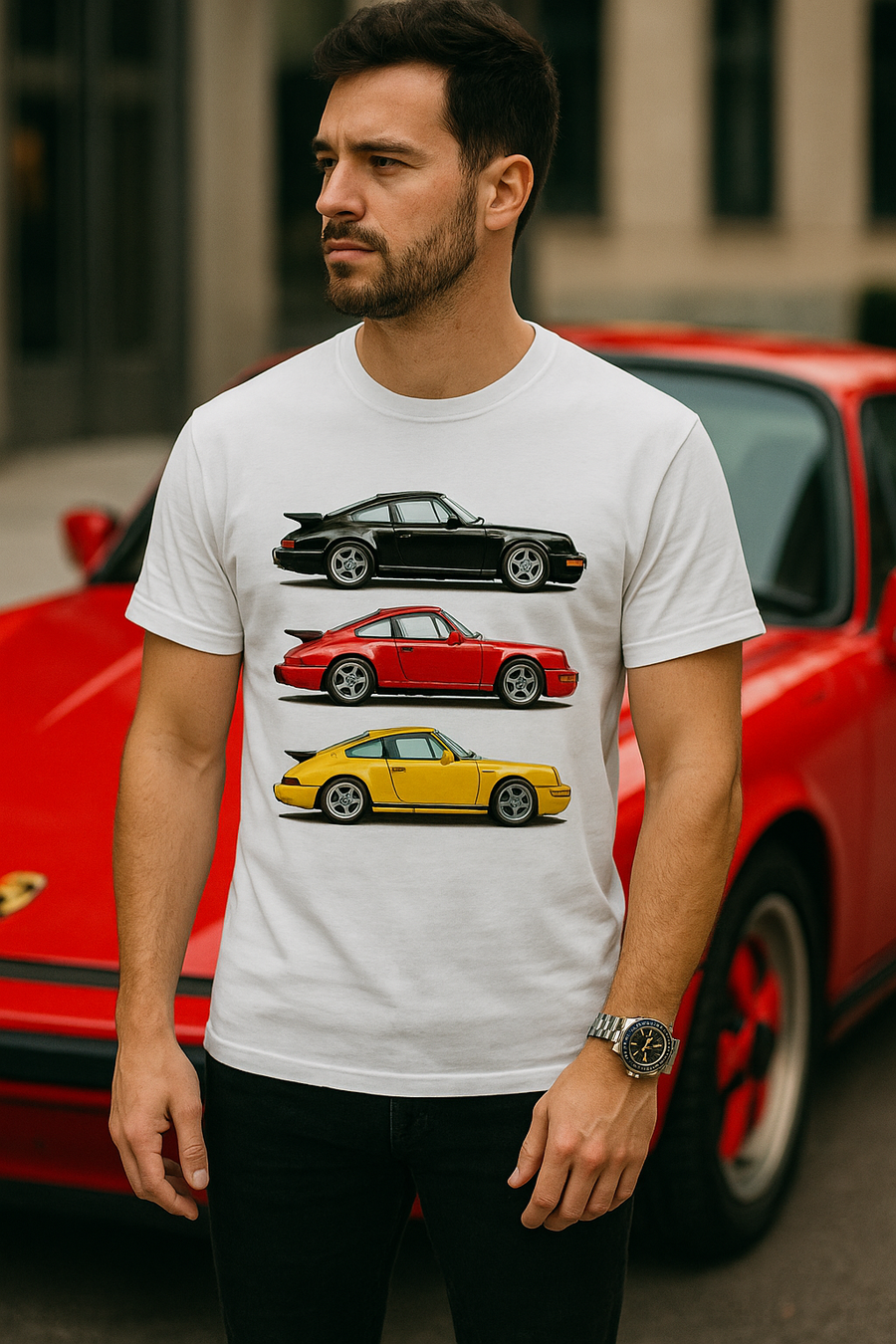 Zeige deine Leidenschaft für das legendäre Porsche 911-Design mit diesem hochwertigen T-Shirt. Auf der Vorderseite prangt ein dreifaches Seitenprofil der ikonischen 964er Baureihe in Schwarz, Rot und Gelb – perfekt für jeden Fan.